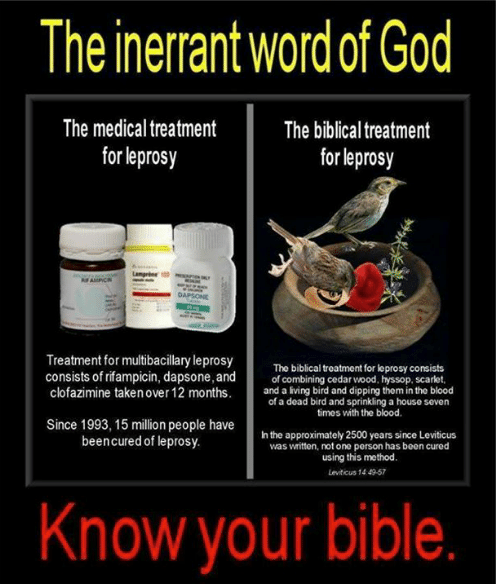 As an inserted Eusebius-Josephus analogy example and a topic explored at my first post, below is the tribal desert cacodemon Yahweh-Jehovah’s (aka “God” to some people for some weird nonsensical reason) “Official Secret Recipe For Curing Leprosy” that he wrote in the book of Leviticus and that’s the official blood magic that’s right from the camel’s mouth that you simply can’t deny, and it’s the most wisest best leprosy cure from the most wisest all-knower of the universe that today’s doctor’s voodoo witchcraft practitioners and pharmaceutical sorcerers are blatantly and knowingly disobeying, the divine step by step instructions for curing leprosy are…
