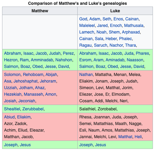 Actually both genealogies are mainly just directly “lifted” (aka plagiarized) from the OT anyway, a straight copy and paste, then just tweaked-edited as each writer wanted symbolic magical numbers of generations in their equations, using of course gematria as the rules (3 sets of 14 in Matthew and both using factors of 7 which is the main important thing for accuracy, everyone knows that). Matthew has forty-two generations from David to Joseph, whereas Luke has seventy-seven generations from his God to the Jesus (76 generations from Adam to Jesus though), with almost no overlap between the names on the two lists. This is because in reality, the gospels-novels writers had no great desire to fulfill any historical accuracy; just like the OT scribes-authors before them they had an agenda and only symbological requirements and magic numbers calculations for their devised “theological truth claims” (aka “Pretend Truth”), to hell with reality and real facts more or less (also interesting is that the anonymous Matthew gospel-novel writer decided to omit and leave out a number of named generations and kings from his “lifted” OT text specifically so he could claim 3 sets of 14 generations equaling 42, however even still his last set is actually only 13 generations so just yet another problem on top of the contradictory “Luke” genealogy problems). Humans genetics, real world history, anthropology, palaeontology etc are not factors in the scam faked genealogies either…obviously. The “Luke” writer also failed to remind in his amazing super-duper wowee genealogy that the entire population of humanoids on the entire planet as told according to his believed version of history-reality, derive from just 3 men and not just only his failed magic man superhero, which would technically mean Jesus was likewise a product of incest (that’s the only conclusion from the written sources and implied information so these gosh darn dang awesome genealogists don’t have much foresight, hindsight or even common sense about these things, because where else are any further humanoids supposed to come from? the magical stork delivered them? a magical ghost pigeon just suddenly made them appear? perhaps). See also “Virgin Birth: It’s Pagan Guys. Get Over It” and “Dying and Rising Gods: It’s Pagan Guys, Get Over It” for more general information.