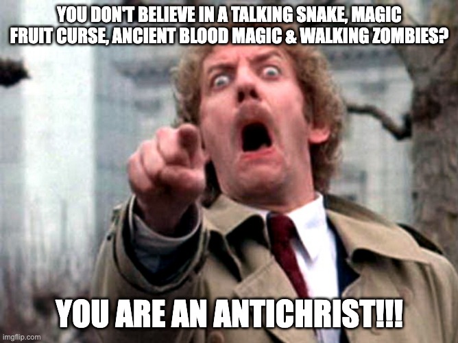 Which is why I decided to post this here and tell the real story of what’s going on so to speak. Because even though I already came to the conclusion a long time ago while in my early teens, even before that actually, that the bible, and Abrahamic religions in general, but especially biblical stories material, was mostly fiction, fables, fraudulent mythomanias, later forgeries and basically invented primitive Bronze Age and Iron Age behaviorisms and theologies leftovers, something even completely alien to me (as well as contradictory and failed wrong in many places), but I still didn’t particularly like the fact that I was told to believe them and even have my young mind inundated by their various media scoundrels and television mind control propaganda also (particularly on Sundays when channelsurfing for something real and interesting to watch but instead having my eyeballs, ears, personality-identity and my rightful common sense violated and accosted with religious quackery fabulist’s fake history tricks, self-loathing displays and lying charlatans faith-shekels seeds schemes (just like a television-sectarian excreta virus’ outstretched tentacles trying to feed on my brain and control my mind to do their bidding and enter their pretend world dreamscape circus-carnival and contradictory and ridiculous fantasies instead of existing in the real world and real cosmos), particularly when I came to realize they were lies and people making things up for their own agendas, feeling particularly violated with them attempting to fill my head with all sorts of strange warped pretend world hocus pocus doctrines and contradictory false information ramblings about all sorts of weird and warped things written by anonymous weirdos in some desert somewhere that were just their own invented agendas and pretend world ideas, abstract concepts and imaginations in their own mind, if they even existed in the first place which was very improbable anyway and more often than not impossible and proven so numerous times in numerous ways. Even at that young age I felt absolutely no natural affinity or any kind of connectedness to the various superheroes, characters, events, ideas, traditions, customs, their beliefs, the various blood magic sorcery and magic tricks, smitings-blessings, the weird foreign deserts mega-ethnocentricism themes that was not part of my history or even have anything to do with me or my history whatsoever, or even with the real world, it all seemed very alien to me, like a natural aversion similar to my aversion to eating insects or maggots, and especially the main presented warped and dumb tribal deity skydaddy-genie character (I realized even back then that It was time to stop fooling myself with confirmation bias and denying cognitive dissonance by just pushing to the side and background the many various contradictions, errors, false information, disturbing grotesqueries and anonymously written nonsense and then just pretending it was all instead perfectly divine information and absolutely all true and perfectly this and that or whatever the guru and religion leader was claiming), because instead they seemed strange, not of this world obscure, nonsensical, ridiculous dreamscapes and theological inventions, extremely far-fetched, absurd otherworldly fictional and just primitive foreign deserts Bronze-Iron Age Yahwehism-Jehovahism voodoo filth irrelevant…