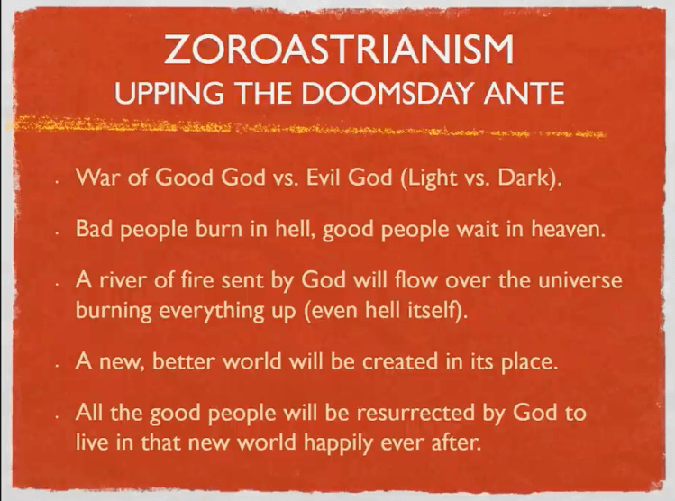 As a matter of fact, Zoroastrianism has played a crucial part in Judaism by introducing very important concepts, ideas and theologies that were not present before the Babylonian Exile, points even admitted to in the Jewish Encyclopedia (1906). The key influencing Zoroastrian concepts such as dualism (good and evil, divine twins Ahura Mazda “God” and Angra Mainyu “Satan”), image of the deity, eschatology, resurrection and final judgment, messianism, revelation of Zoroaster on a mountain with Moses on Mount Sinai, three sons of Fereydun with three sons of Noah, heaven and hell, angelology and demonology, cosmology of six days or periods of creation, and free will etc. It is even largely because of Zoroastrianism that the OT/Hebrew bible Yahweh-Jehovah has its new personality split, with the other half becoming the newly introduced Jewish Boogieman character, aka Satan, Devil etc (more later about this and how Yahweh-Jehovah thus actually is the Jewish Boogieman Satan/Devil).