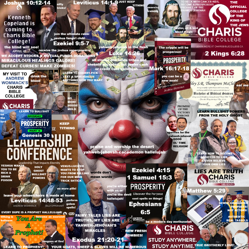 Is the bible the original very first described “Clown World” in existence? Because right from start, from the first written and claimed people, events, magical and non-magical hocus pocus and necromancy instances, failed prophecies (and even things happening opposite to the predictions made by somebody somewhere during the Iron Age), wrong cosmological, historical, scientific and natural world real known and proven facts, the right from the start duped local cacodemon godling character by a talking snake, a magical fruit curse, talking donkey, magical boat cruise ship ride with even dinosaurs passengers, multiple space-time universes realities and stories taking place simultaneously, magical multiple-headed hybrid creatures and beings, magical iron chariots that even a universal god can’t defeat, a god losing a wrestling match to a puny human, floating wheels full of eyeballs, flat earths, genocides and sacrificial killing of entire settlements and towns populations (including every single living and breathing animal also for some reason), hairy as goat-fur people, fire magic, water magic, weather magic, a puff of smoke local godling’s weird senseless obscure commands, atrocious real estate deals, a local cacodemon godling that sends deceiving spirits, lies and admits creating evil, torah-zombies, sheepism-goatism blood magic (and pigeon blood magic, cow blood magic and oxen blood magic also), contradictions galore, sadistic moronic bets for entertainment and torturously boring long-winded speeches, floating immortal untouchable cosmic demons and archons spirits in the various layers of outer space, stopping the earth from rotating and orbiting, backwards working sundials, contradictions ad nauseam, magical miracle shadows and hankies, sins of fig trees, lost ufo-stars, demon swine, magic numbers, mutating and contradicting ideas, beliefs, meanings and theologies by anonymous writers somewhere,eating bodies and drinking blood and being washed in blood (to supposedly become white as snow? as if), massive armies of virgins on horses (there are horses in heaven apparently, so possibly saloons and rodeos also?), floating immortal untouchable cosmic demons and archons spirits who are powerful immortal untouchable demons in the earth and in the cosmos in the various layers of celestial outer space and who always get the better of and constantly ruin the plans of the Yahweh-Jehovah desert cacodemon godling because he was easily duped by a snake he didn’t know existed and so it had to completely drown and kill off the planet’s entire humanoids populations to fix things but it actually didn’t fix anything (and the six-fingered and six-toed nephilim giants were able to swim anyway and survive to pop up later and they were the main reason for the flood in the first place because they were hybrid humanoids fathered by the immortal floating demonoids beings in outer space, demonoids who were also known as “sons of god” so they were also Jesus’ brothers apparently) so it was actually completely pointless, but then it sacrificed itself to appease itself invisibly without anyone anywhere knowing to get rid of the magical fruit curse once and for all but just like before actually not really, and much, much, much more than the information just mentioned in this blog. Well then surely that’s a real verifiable absurd “Clown World” if there ever was.